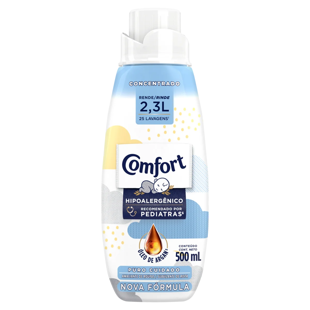 O Amaciante Concentrado Comfort Puro Cuidado tem perfume suave com extrato de aveia e faz as roupas durarem muito mais! Sua nova fórmula contém óleo de argan (um óleo natural com alto potencial nutritivo) que previne os danos da lavagem, mantendo as cores do tecido vibrantes por mais tempo e as roupas perfumadas. Menos de meia tampinha de Comfort concentrado basta para lavar suas roupas. Sua fórmula além de ser hipoalergênica é dermatologicamente testada por pediatras, dermatologistas e outros profissionais da saúde. Dessa forma, o Amaciante Concentrado Comfort Puro Cuidado é indicado para ser usado em roupas de bebês e de pessoas com peles sensíveis e delicadas. Sua fórmula contém extrato de aveia que penetra profundamente nas fibras do tecido durante a lavagem, deixando-as com uma maciez irresistível, toque gentil e com todo cuidado que as peles sensíveis merecem. Sua fragrância foi feita especialmente para transmitir o toque de macio e suave das roupas, além de sua fórmula ser livre