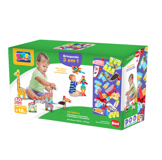 Com 40 peças, crie incríveis personagens. Brinquedo 3 em 1, que estimula a inteligência, criatividade, planejamento e organização.