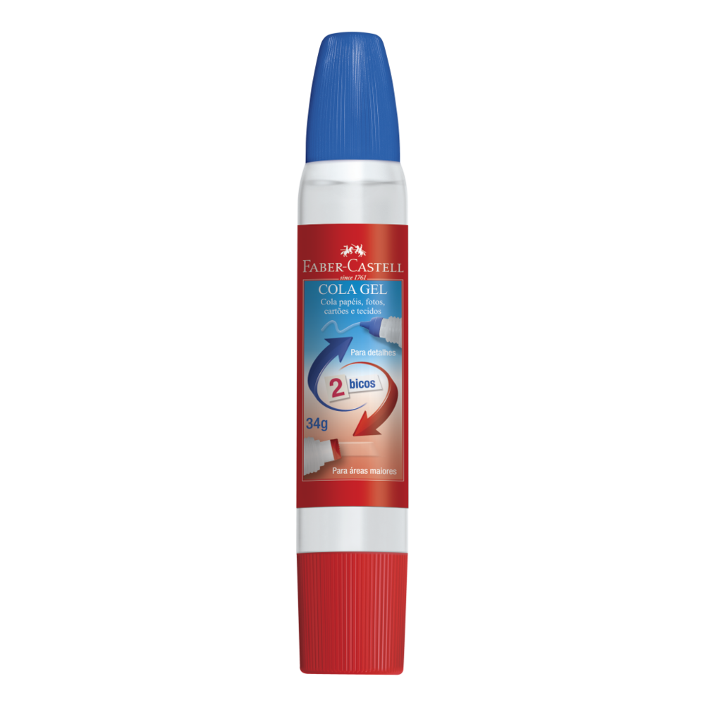 A cola gel da Faber-Castell tem 2 bicos: um bico menor para uso em áreas pequenas e trabalhos detalhados que exigem maior precisão e outro bico com sistema de espalhamento, para uso em áreas maiores. A cola gel 2 bicos foi desenvolvida com o sistema antientupimento: tampas com pino interno para evitar obstrução dos bicos. Cola papéis, fotos e tecidos.