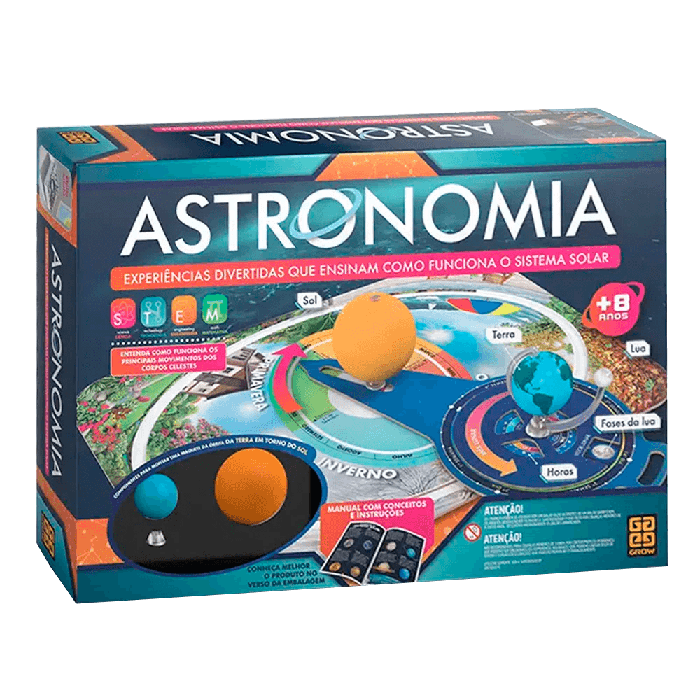 O jogo de ciências Astronomia é ideal para um ou mais participantes acima dos 08 anos de idade! Com muito conteúdo didático e educativo, o jogo Astronomia é inspirado na metodologia de ensino STEM (sigla em inglês para Ciência, Tecnologia, Engenharia e Matemática). Aqui, você pode montar uma maquete da órbita da Terra em torno do Sol para entender sobre os movimentos dos corpos celestes. Ou até mesmo simular as estações do ano, os eclipses e outros fenômenos do espaço. Crie seu próprio projetor de constelações, relógio de sol e foguete. As possibilidades, assim como o universo, são infinitas! Todas as regras do jogo educativo Astronomia estão incluídas junto com o manual do jogo. Basta encontrar suas companhias, seguir as regras e partir para a diversão!